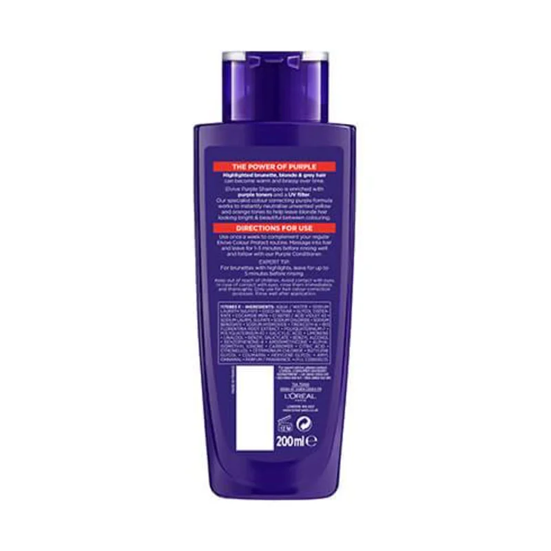 Introducing Purple Shampoo from Elvive Colour Protect, Britain’s number 1 for colored hair. Highlighted brunette, blonde, and grey hair can become yellow and brassy over time. The purple color is the opposite to yellow on the colour wheel, the purple within the Purple Shmpoo formula helps neutralise yellow tones. Our new specialist colour correcting Purple formula nourishes hair & neutralizes unwanted yellow, orange, and brassy tones in just one use, to help leave hair looking bright and beautiful.