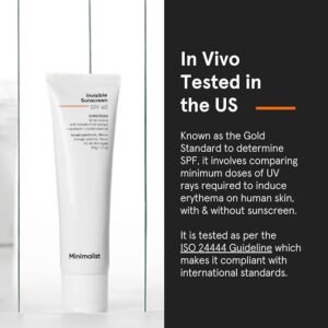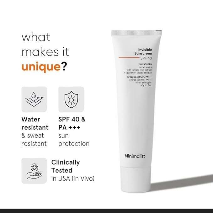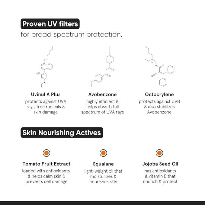 An invisible, sweat & water-resistant sunscreen that leaves absolutely 0 white cast on application. It’s a lightweight, moisturizing, antioxidant-rich SPF that does not pill & is loaded with very effective UV filters to provide protection from UVA & UVB rays.