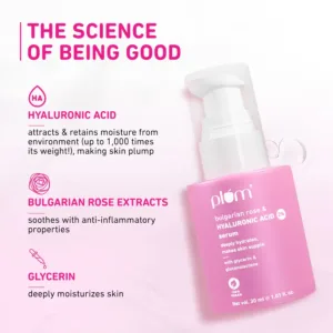 Plum 2% Hyaluronic acid serum Formulated with soothing rose water extracts, the 2% Hyaluronic Acid Serum hydrates and calms dry & inflamed skin. It contains natural humectants that attract and retain water, leaving your skin looking plump and bouncy, making it one of the best hyaluronic acid serums for the face.