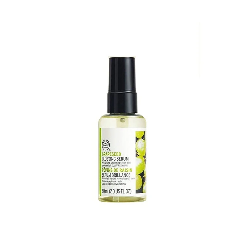 The Body shop Grapeseed Glossing Serum Smooth your hair and increase the shine with this glossy serum. Apply a small amount through your hair, for the best results.